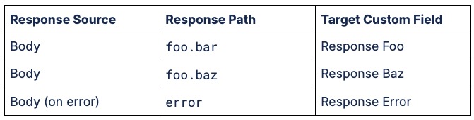 Response mappings let you extract data returned from an external service and store it in custom fields associated with your integration. Each mapping row consists of: