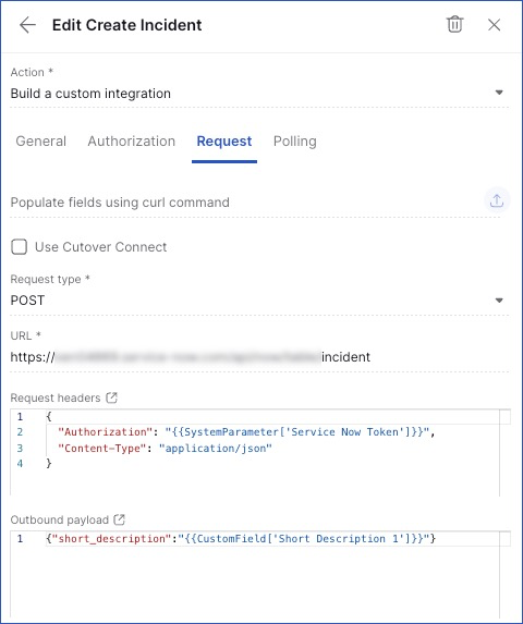 Note: If a custom field (CF) type is configured with the Temporary credentials type, system parameters must be used instead. Temporary credentials are not supported in this context and will not resolve correctly. Referencing system parameters ensures credentials are handled securely and reliably.